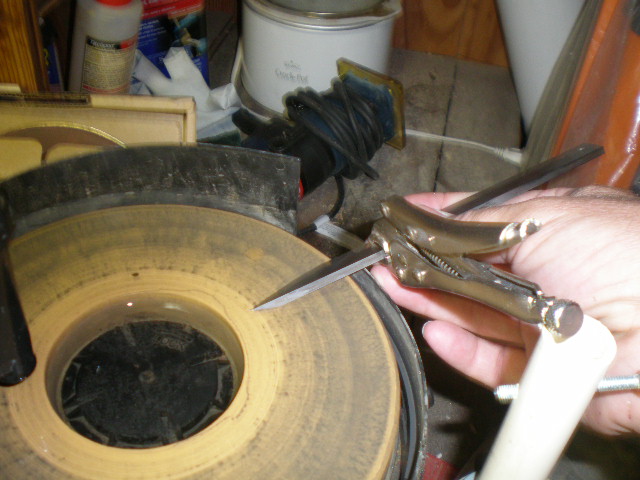 The back end of the vise grip is round. This will be the pivot point, resting in the notch in the PVC toolrest.